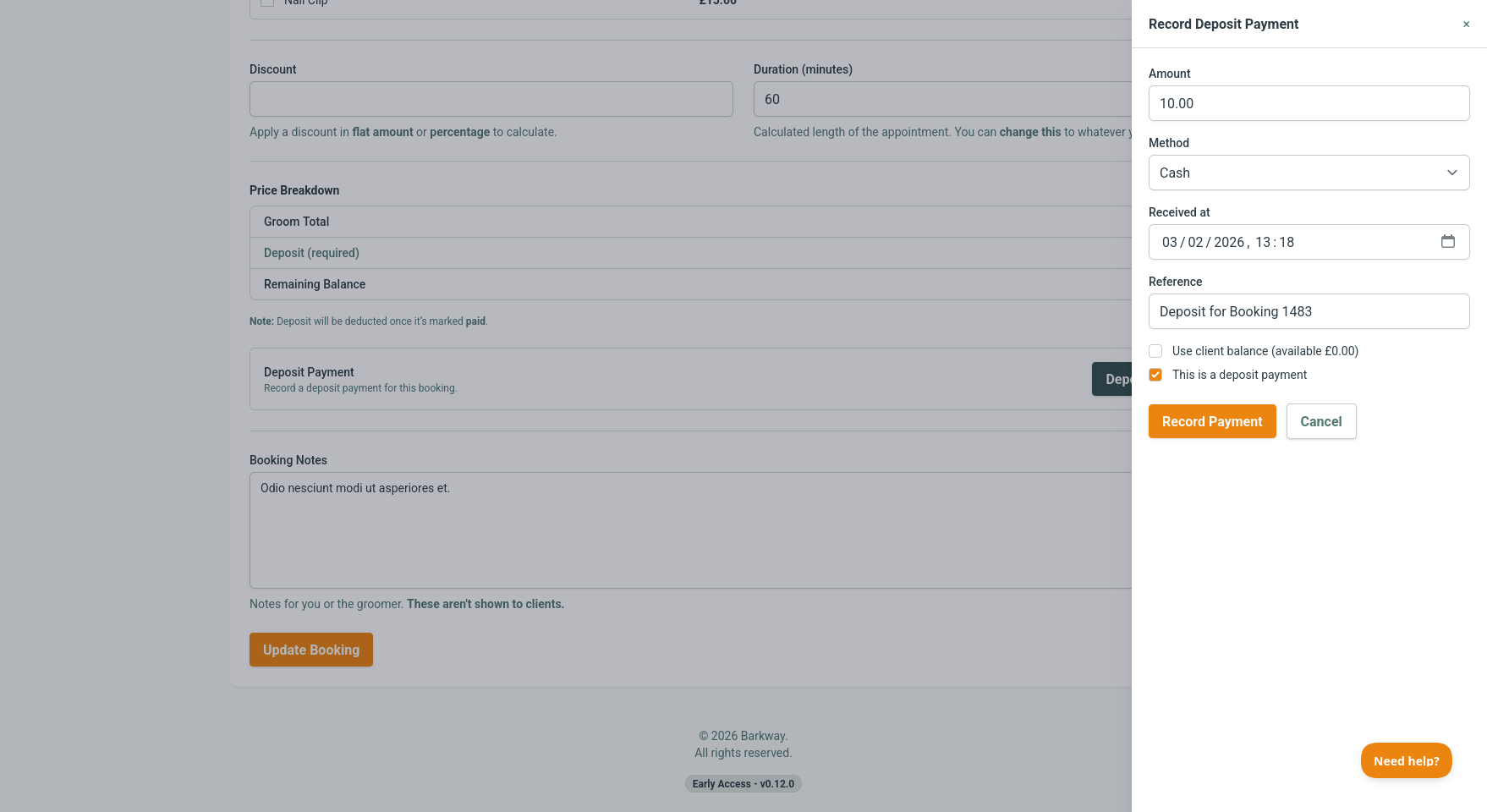 If Allow deposits is enabled in Settings, Barkway calculates a required deposit from your default amount (fixed or %). You can still decide when to collect it, but the booking will show the deposit as unpaid until it’s recorded.