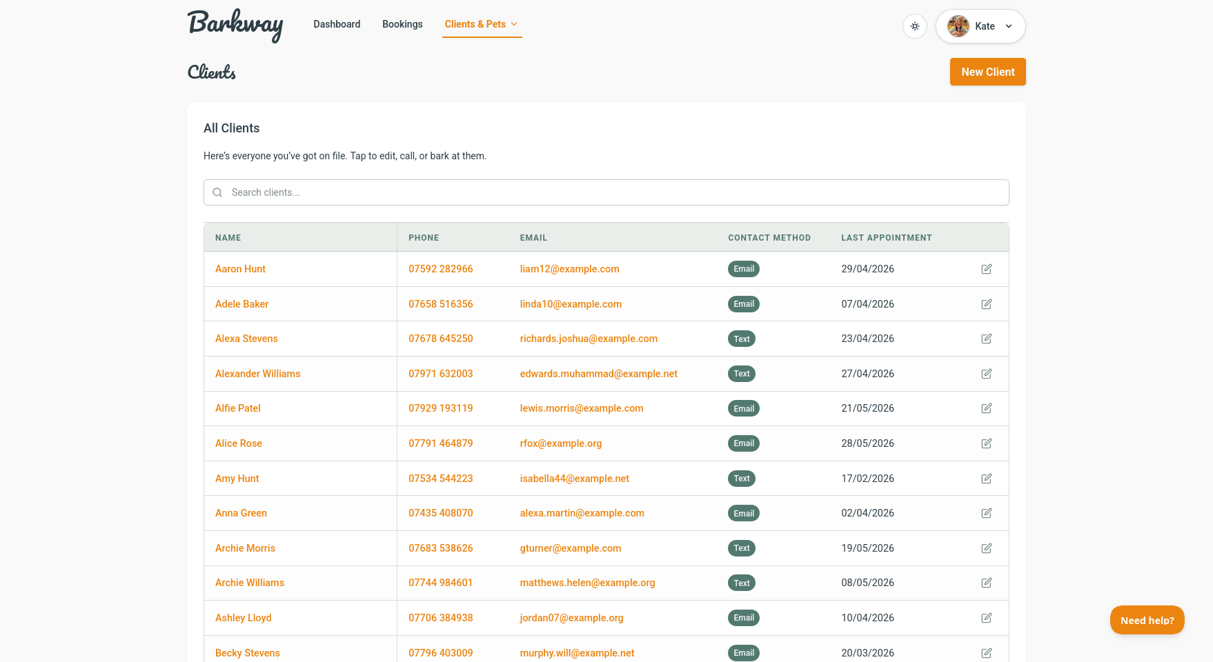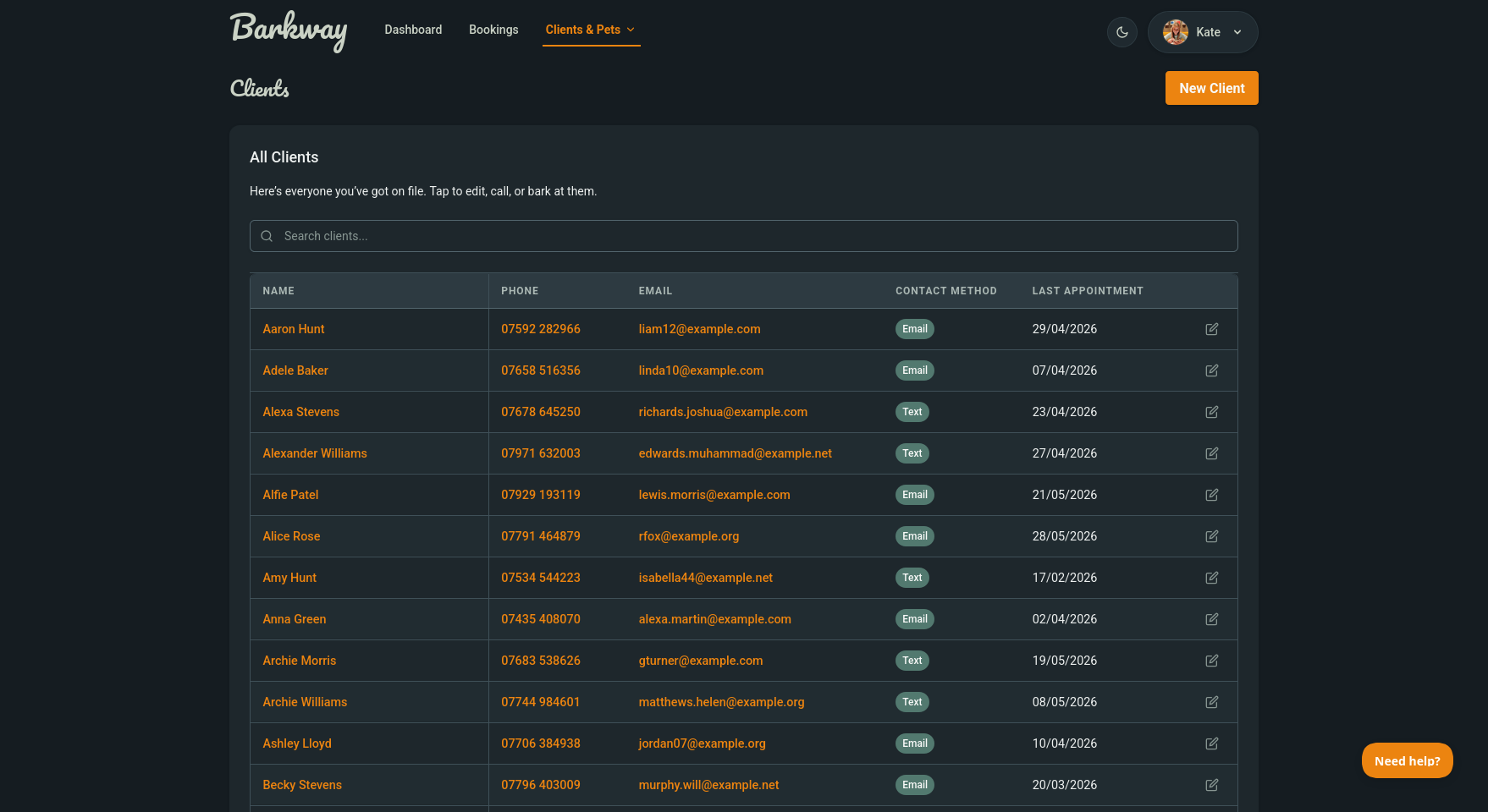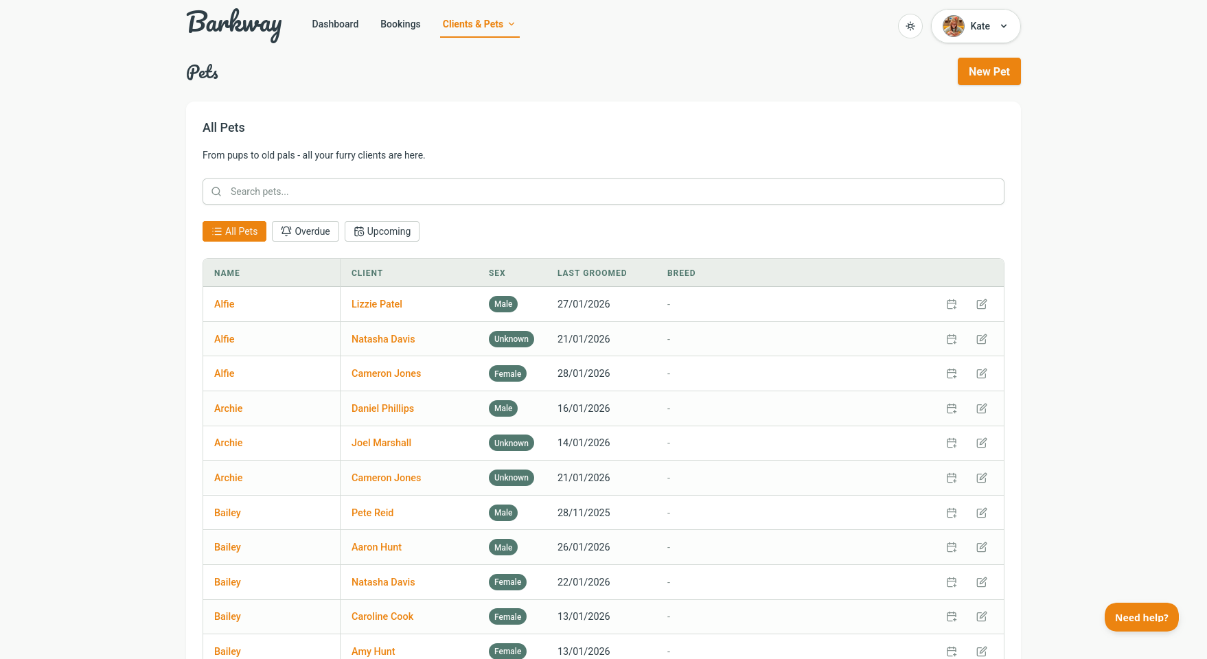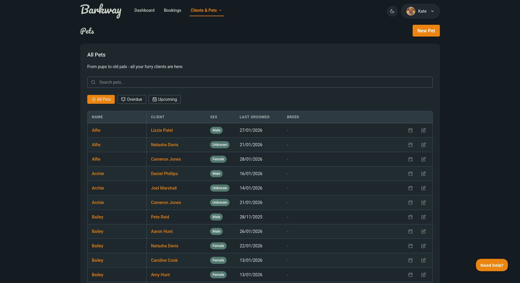Every booking starts with a client (the human) and a pet (the dog, cat, or even that one brave soul who brings a snake).