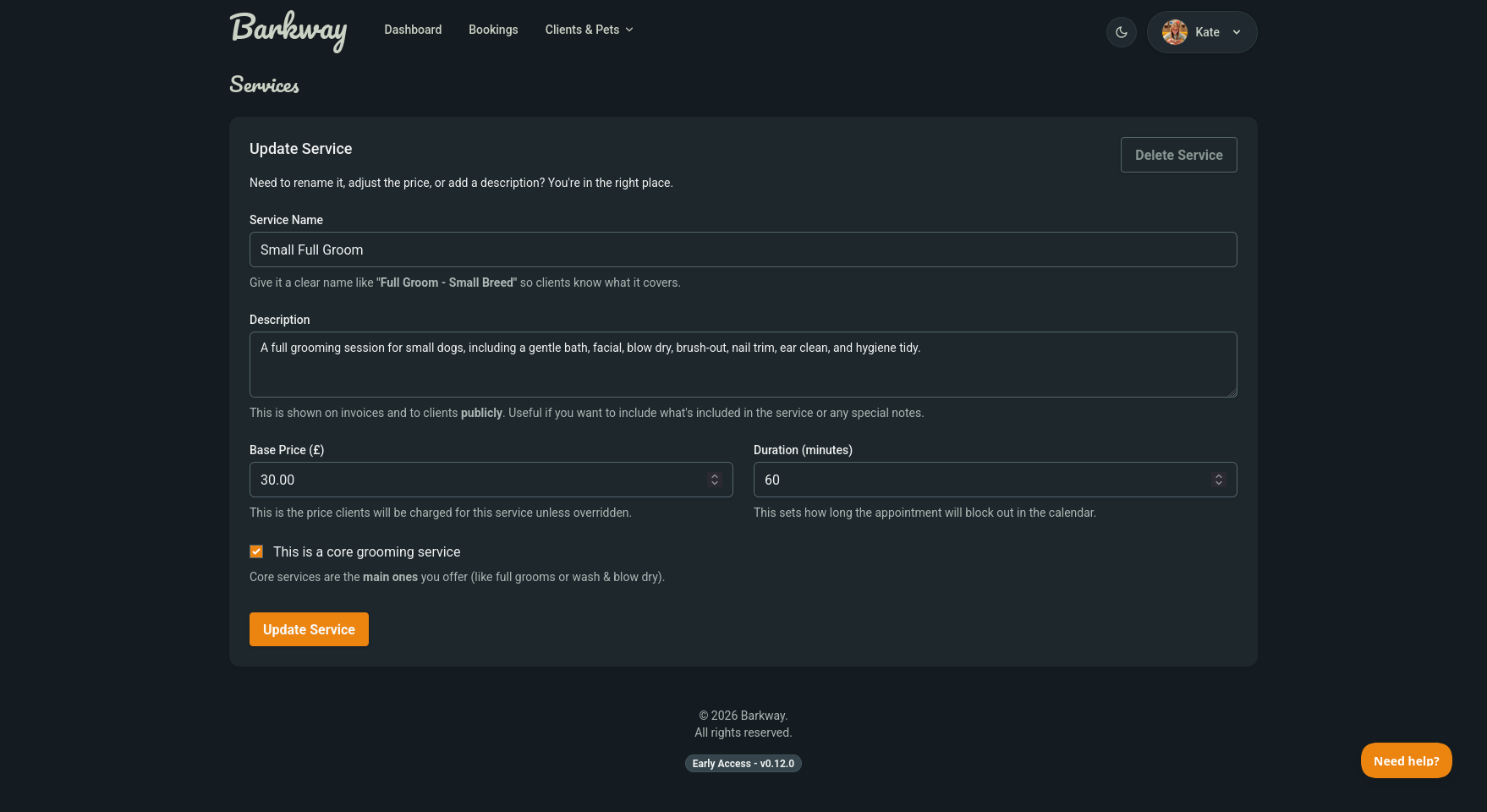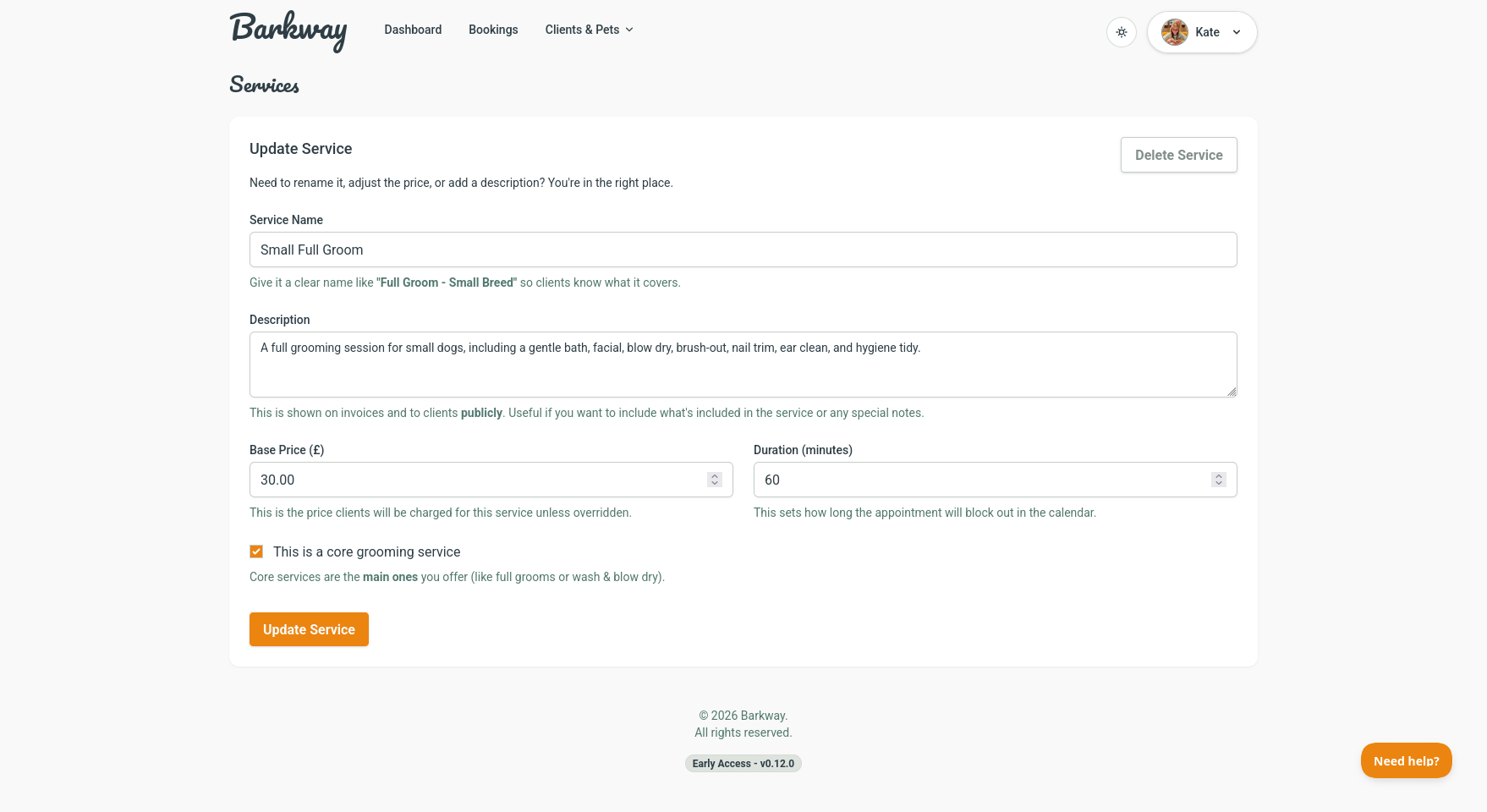 Services are the backbone of every booking. They tell Barkway how long an appointment takes and how much to charge - once you’ve added them, the calendar and invoices pretty much run themselves. ✂️